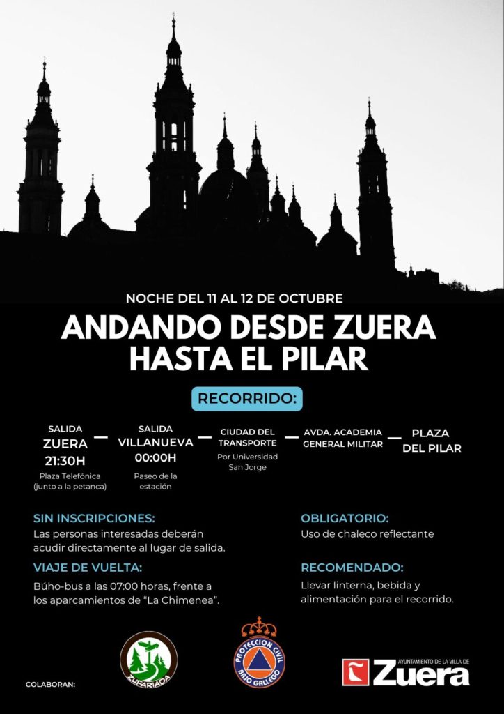 Es tradición en la noche del 11 al 12 de octubre bajar andando desde Zuera hasta la Basílica de Nuestra Señora del Pilar para celebrar su festividad. Un evento tradicional que cuenta ya con varias ediciones y donde colaboran Zufariada, Protección Civil del Bajo Gállego y el Ayuntamiento de Zuera.