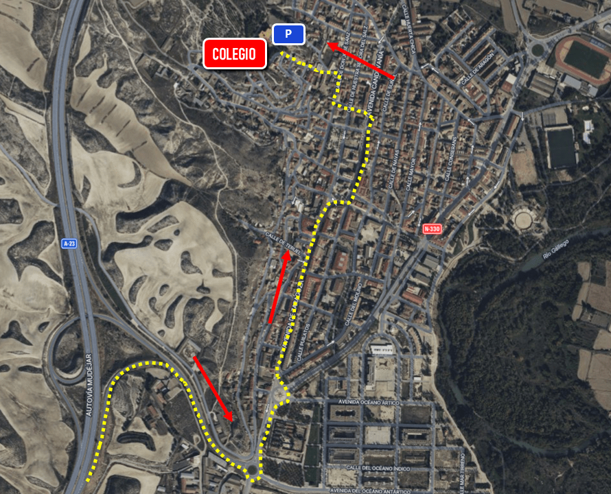 Desde la autovía A-23 tomar la salida 314 (Zuera Sur). En la siguiente rotonda salir a la izquierda a la altura del cementerio y acceder al casco urbano por la Avda. Zaragoza, Calle Jorge Luna, Avda. Candevanía, Calle Ramón J. Sender, Calle José Sanz y Calle Antonio Machado hasta llegar al aparcamiento del colegio.