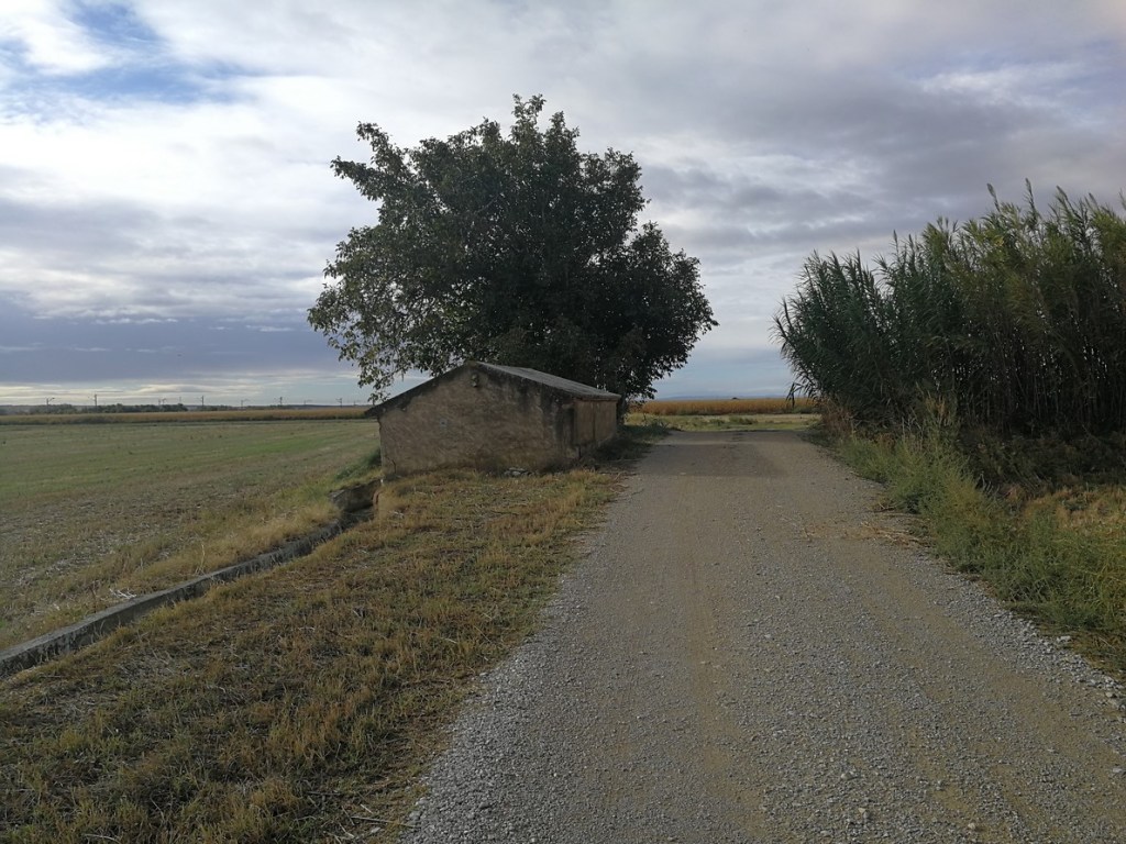 Dejamos una caseta a nuestra izquierda y seguimos el camino en dirección sur, por la zona de huerta. Tras dejar un corral a nuestra izquierda y una nave agrícola a nuestra derecha, el camino gira 90º a nuestra derecha en dirección oeste, hacia la carretera.