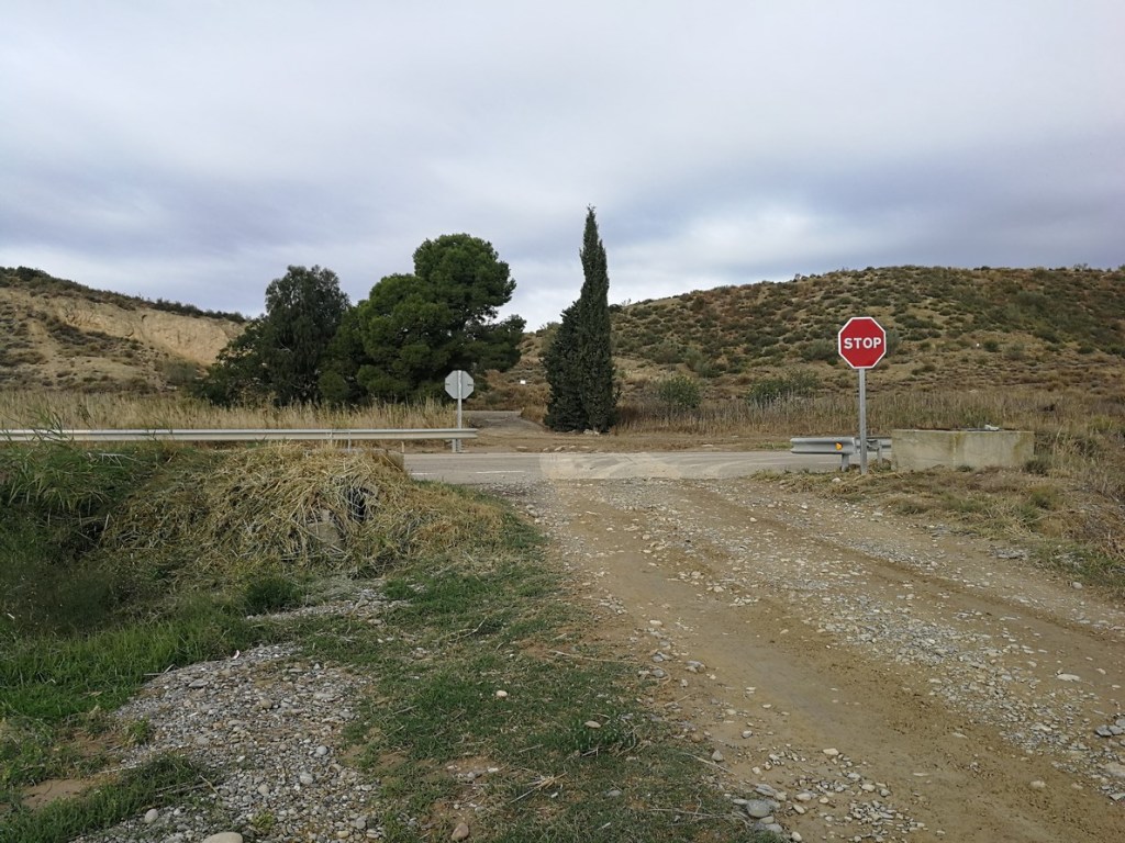 Cruzamos sobre la acequia y pasamos entre una nave agrícola y una granja antes de llegar a la carretera N-330, que cruzamos para girar inmediatamente a nuestra derecha por el GR-234 «Camino de la Jorgeada», en dirección norte y paralelos a la carretera.