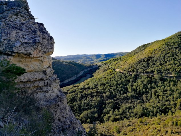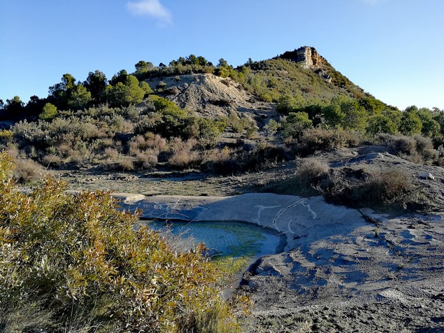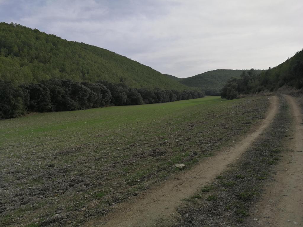 La fuente lleva años sin manar, pero podemos ver los restos de como se intentó canalizar su cauce. Volvemos sobre nuestros pasos al camino de la val y retrocedemos unos metros val a abajo para desviarnos por el campo de nuestra derecha, a buscar el inicio de una pequeña val entre el pinar.