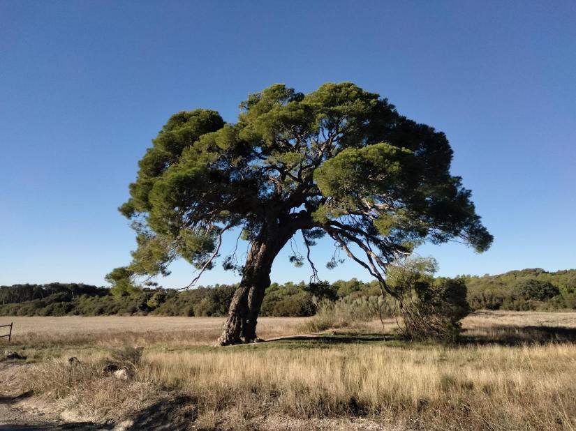 Volvemos sobre nuestros pasos unos metros y giramos a la derecha para bajar por la Val de Navarro, para descender hasta el Pino Valdenavarro. Este pino es un símbolo de Zuera y es considerado el más longevo de los existentes en la zona. En el gran incendio forestal del año 2008, se estableció un operativo especial para salvarlo. En el año 2015 fue declarado “Árbol Singular de Aragón” + INFO