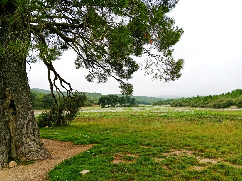 Llegamos a la pista que viene desde la zona de asadores de Cuatro Caminos y la tomamos a nuestra izquierda. Tras cruzar un sembrado nos desviamos por nuestra derecha por un pequeño sendero que atraviesa el pinar y en el que podemos ver unos metros más adelante el límite sur del gran incendio forestal del año 2008. Nos adentramos en una zona de pinos jóvenes, coscojos y romeros, que es la zona que se está regenerando después de aquel incendio.