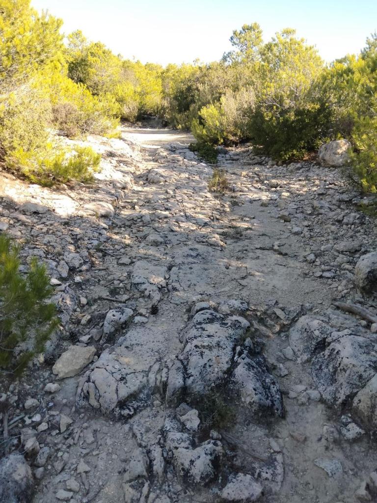 Nos desviamos a nuestra izquierda por el cortafuegos que tenemos justo enfrente. A los pocos metros salimos del cortafuegos por un pequeño sendero que sale a nuestra derecha (marcado con un mojón de piedras). Unos metros más adelante volvemos a ver el límite sur de la zona calcinada durante el incendio de 2008, ya que pasamos de una zona con pinos muy jóvenes que se están regenerando después del incendio, a otra zona de pinos más grandes y viejos, que fue la que se salvó del incendio.