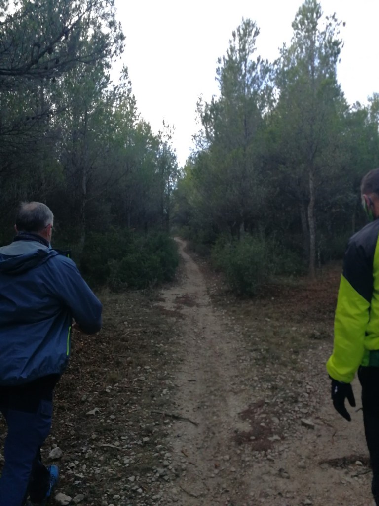 El sendero acaba en la pista que se dirige a Cuatro Caminos, donde giraremos a nuestra izquierda, a la altura de la Casa de Cagarroz. Inmediatamente volveremos a girar a nuestra derecha, para descender por el camino de la Val de Zaragoza. Tras un kilómetro por el camino, nos desviamos a nuestra derecha por un sendero, que por el pinar, descenderá de nuevo hasta la zona de asadores.