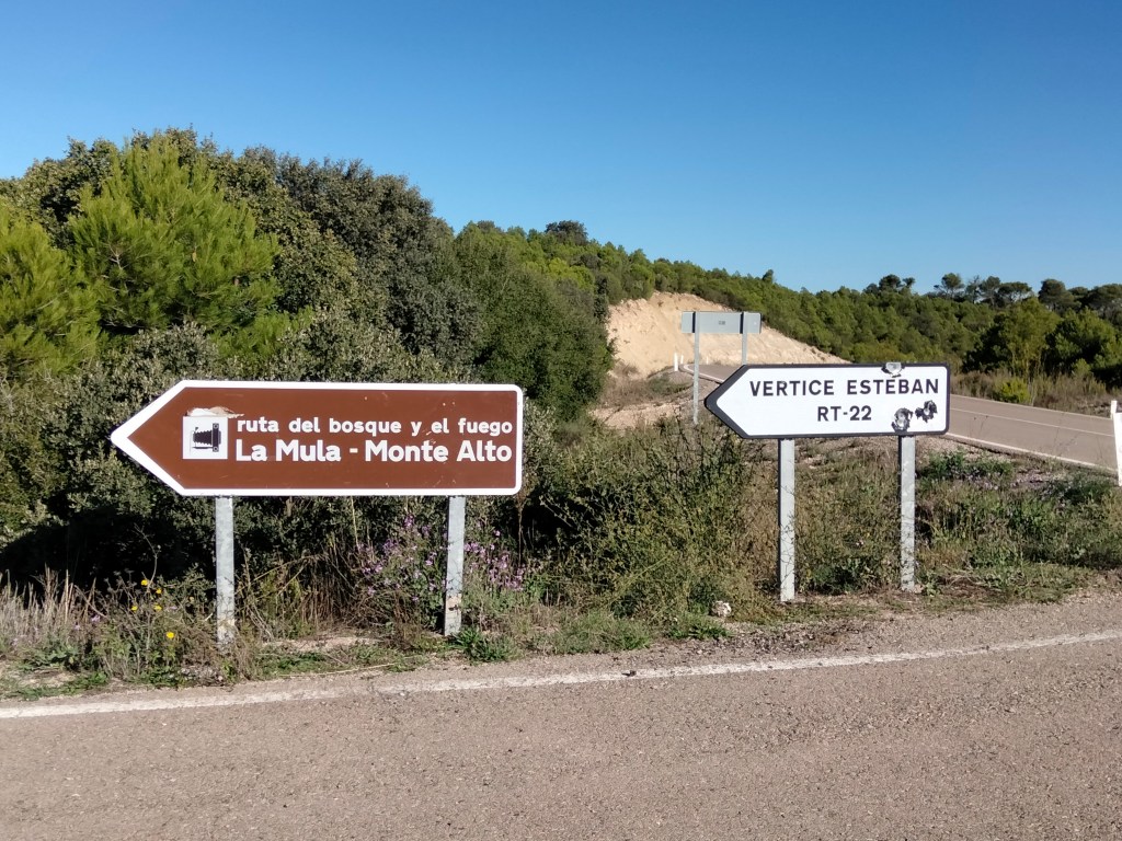 Comenzamos la ruta por la carretera de acceso al acuartelamiento militar, hasta llegar en poco más de 500m al Mirador de La Mula, donde encontraremos un panel explicativo de la Ruta del Bosque y el Fuego. Desde este mirador podremos ver como se está regenerando el bosque tras el incendio de 2008 y con unas buenas vistas sobre la zona de Val de Navarro, El Castellar y en días despejados, del Valle del Ebro.