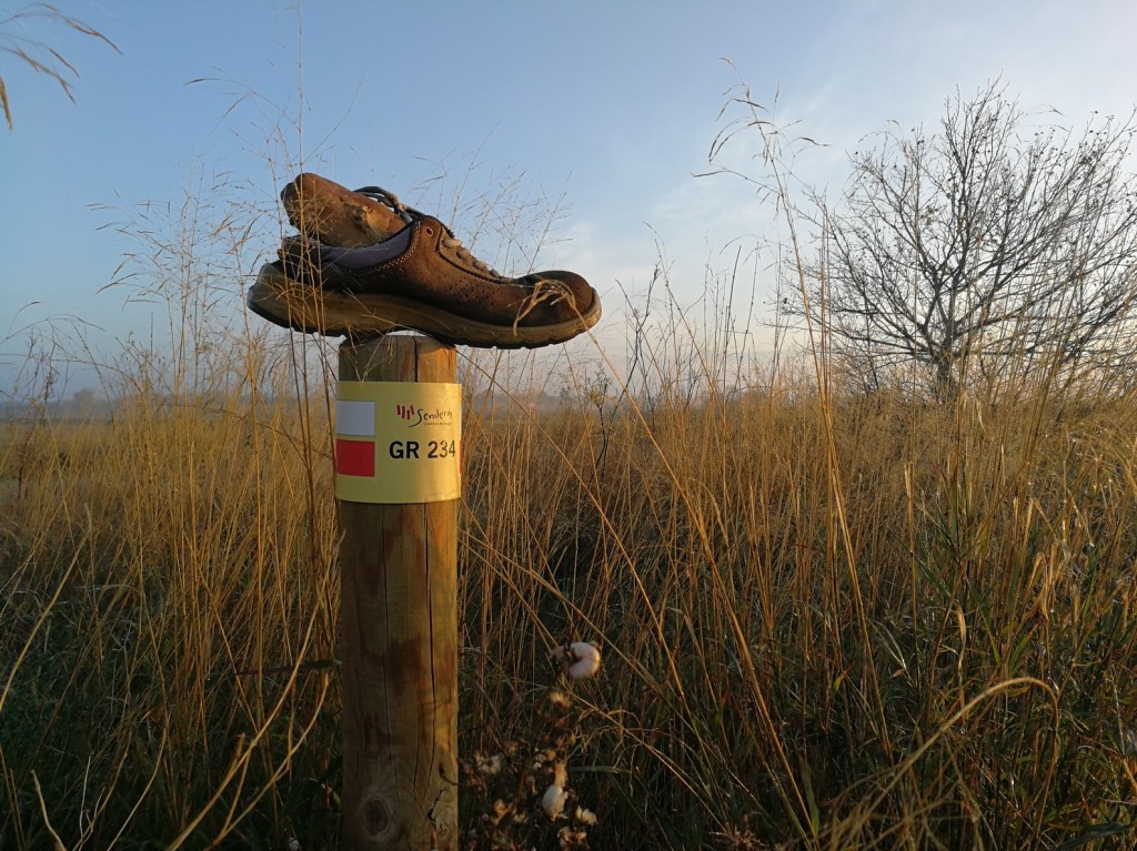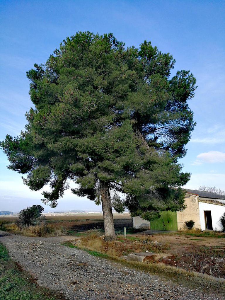 Giramos a la derecha por el camino de la acequia y a los pocos metros tomamos un camino a la izquierda en dirección a las vías del tren. En este camino podemos ver junto a una caseta un pino de grandes dimensiones, que fue plantado en 1978 por Javier Lanas, del equipo de Zufariada. Al llegar a la altura de las vías, conectamos con el GR-234 “Camino de la Jorgeada” y lo recorremos unos pocos metros en dirección Zuera, hasta que nos desviamos a la derecha para cruzar el puente sobre las vías del tren.