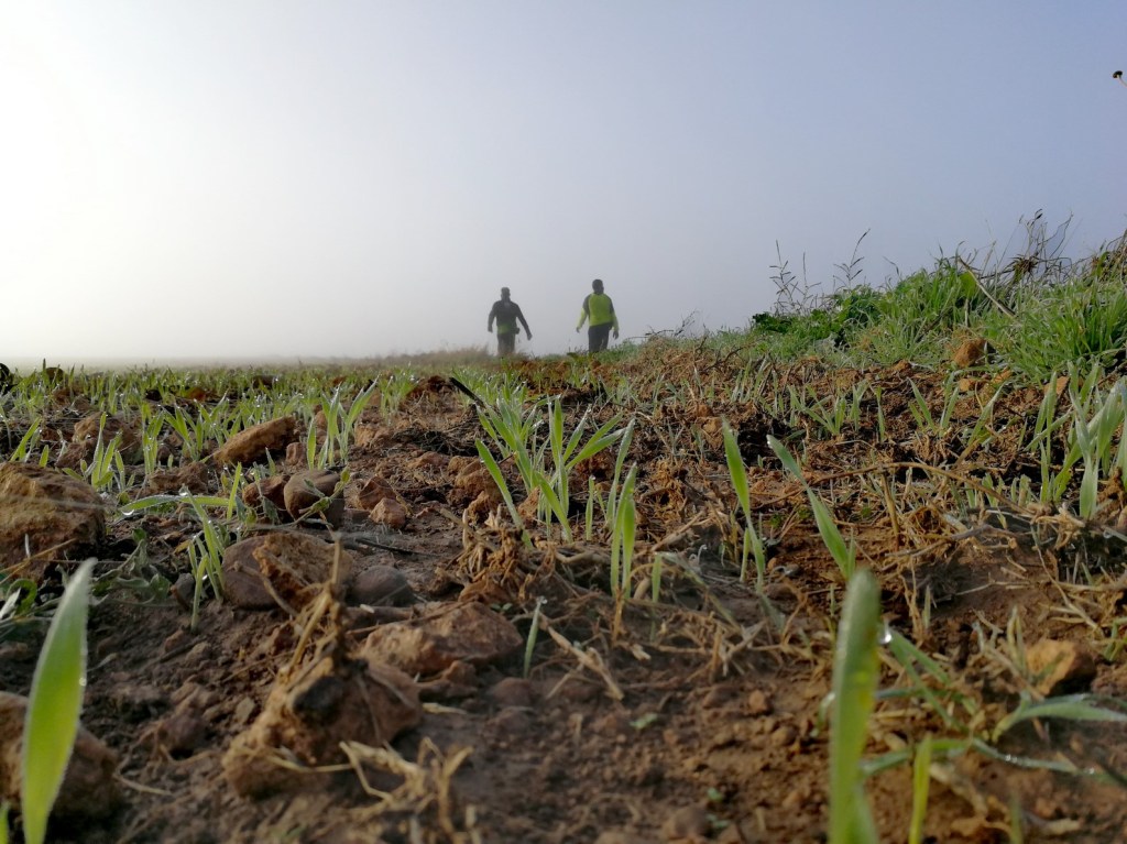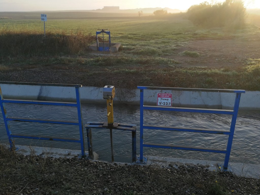 Desde aquí nos dirigimos al puente que hay sobre las vías del tren, al norte de Puilatos. Lo cruzamos y llegamos hasta el camino de servicio de la Acequia de la Violada. Giramos a nuestra izquierda, paralelos a la acequia, y tras 800 metros nos desviamos a la derecha por un camino por la zona de Puilatos Bajo.