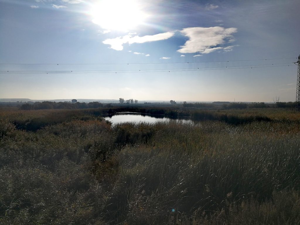 Tras cruzar el puente y bajar al camino, nos desviamos por la izquierda por la linde entre dos campos, que nos llevará al camino paralelo al Barranco de Valdeparadas. Unos metros adelante, lo cruzamos por unos bloques de hormigón y seguimos por el camino hasta la carretera N-330. En este punto, nos desviamos a la izquierda unos metros por el arcén para visitar la Alberca de Valdeparadas o Laguna de Puilatos, que es un humedal que se ha formado recientemente en un páramo, al final del Barranco de Valdeparadas, y que sirve de cobijo para aves, como la avutarda.