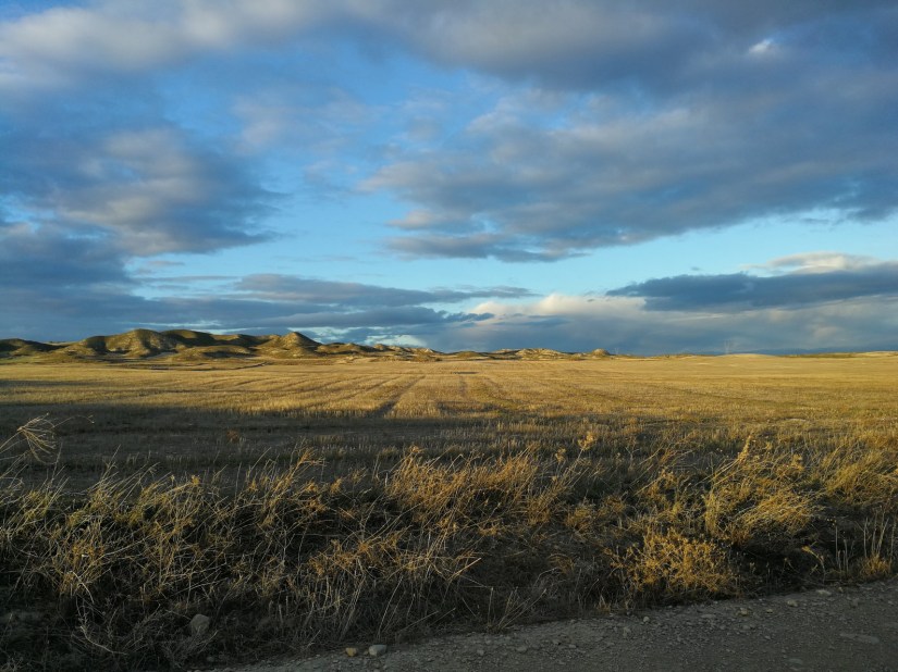 Giramos a nuestra izquierda en dirección a Zuera. Dejamos a nuestra derecha la zona de Las Peñetas, más abajo los Tres Pueyos, el Acampo Martón (Acampo de Cacericos) y a nuestra izquierda el Acampo de Miguelico.