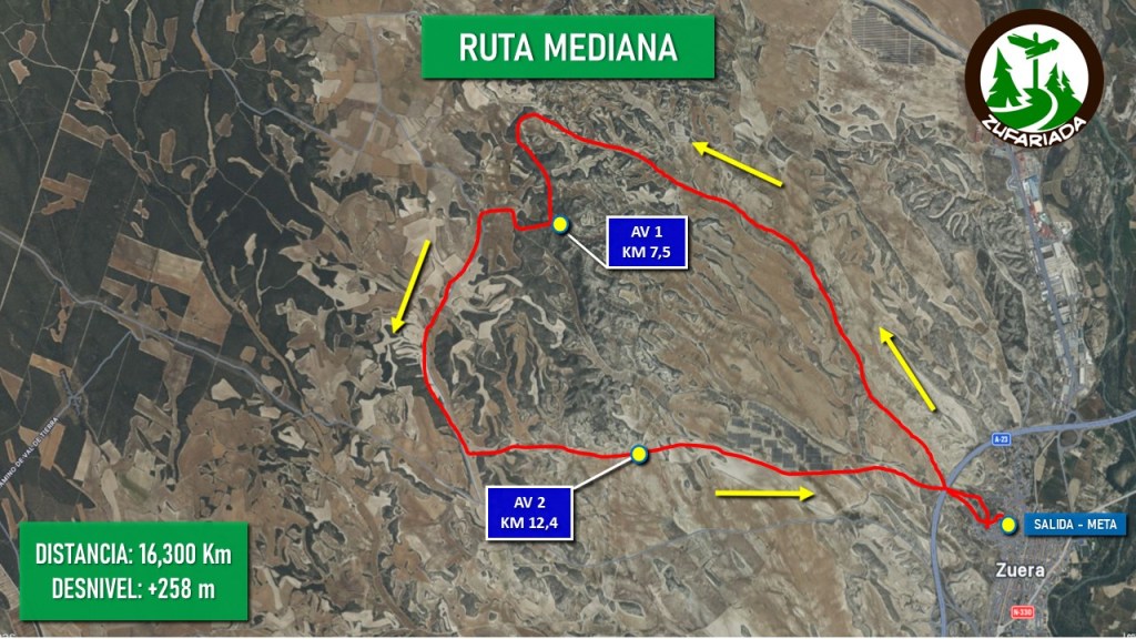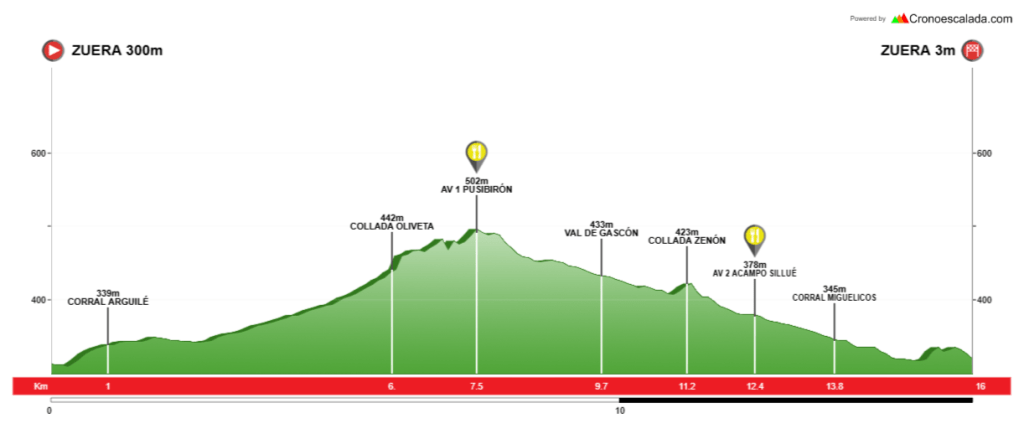 - Terreno: Caminos 13,900 Km (85,3%) – Senda 1,500 Km (9,2%) – Asfalto 0,900 Km (5,5%)