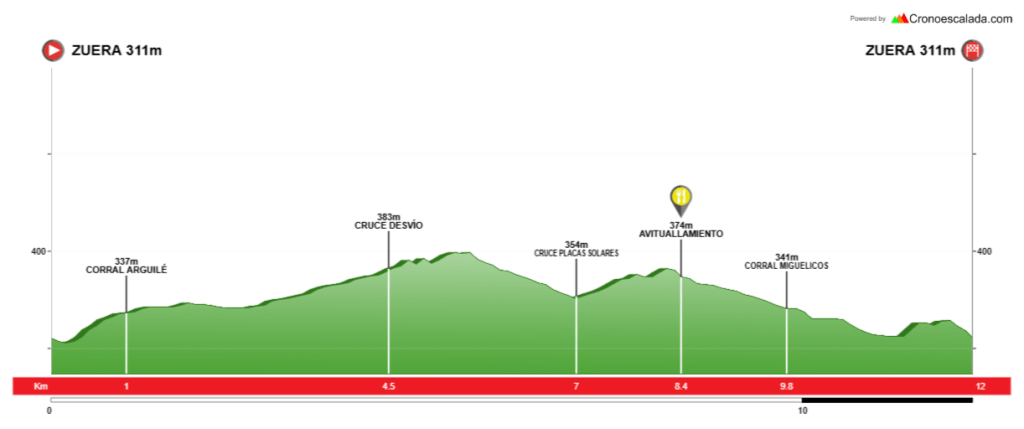 - Terreno: Caminos 11,200 Km (91%) – Senda 0,200 Km (1,6%) – Asfalto 0,900 Km (7,4%)