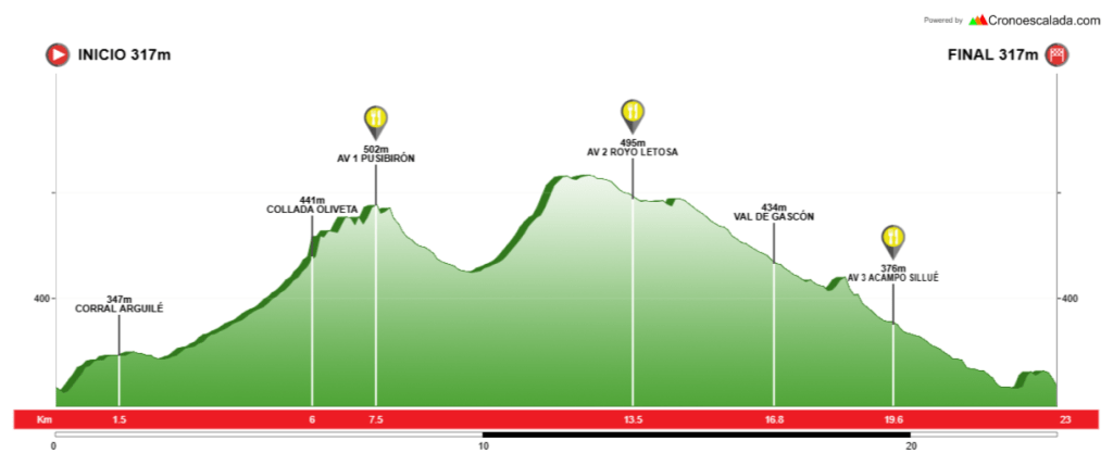 - Terreno: Caminos 20,500 Km (87,3%) – Senda 2,100 Km (8,9%) – Asfalto 0,900 Km (3,8%)