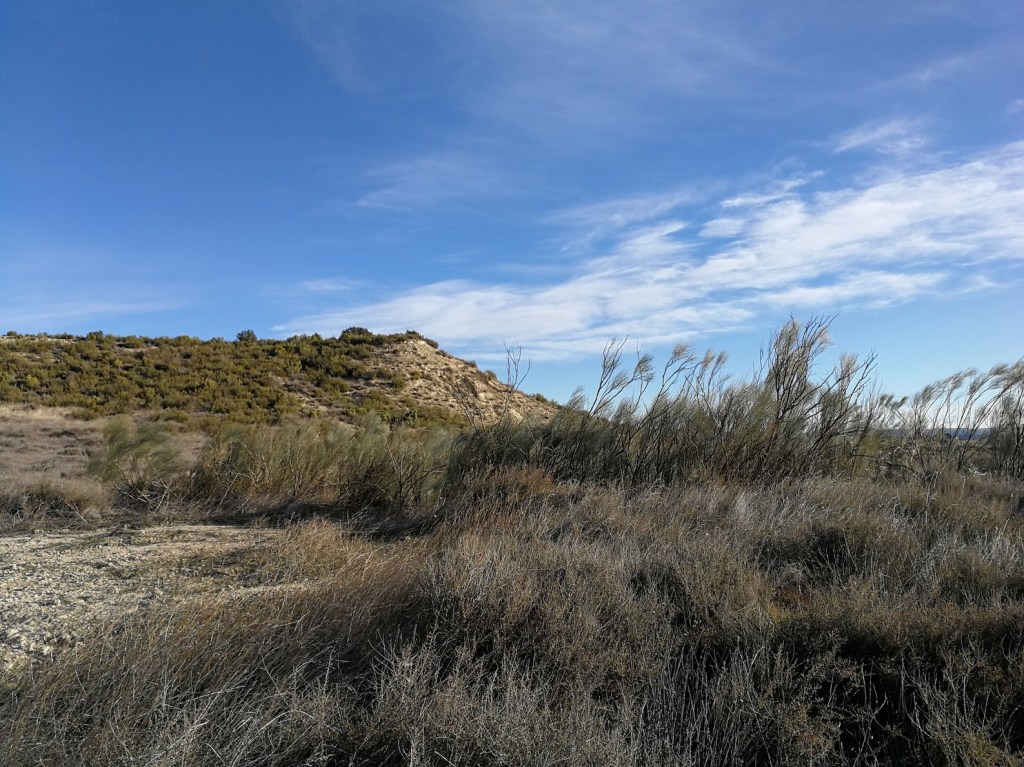 Unos metros más arriba encontramos un desvío a nuestra derecha por donde podríamos bajar a la Carretera de Ejea, justo en el cruce con la Carretera de Gurrea. Seguimos recto por la zona sur del Pico Grallero y ya el camino comienza a descender, dejando a nuestra izquierda la Caseta de Casanova hasta que conectamos con el camino de la Val de Castellano, a la altura de las ruinas de la Caseta Puyal.