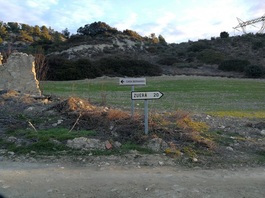 Iniciamos la ruta en dirección norte, por el camino de la güega del Monte de Zuera con el Monte de Castejón. Este camino marca el límite entre los términos municipales de Zuera y Castejón de Valdejasa. Avanzamos por el camino y dejamos sucesivamente a nuestra derecha los desvíos hacia los Pilaretes, la Juntuela y el Transil.