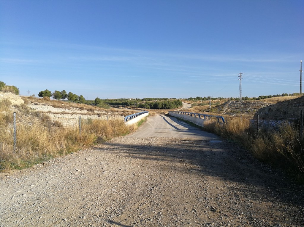 Seguimos por la zona trasera de los adosados y salimos a la Calle Loma Blanca, donde giraremos a nuestra derecha para cruzar el puente sobre la autovía A-23. Nada más cruzar el puente tomamos una bifurcación a nuestra derecha, para ir ascendiendo poco a poco por el camino del Campillo.