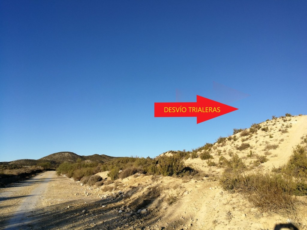 Poco después del kilómetro 3 de ruta, pasada la línea de alta tensión, nos desviamos a nuestra derecha por una trialera que sube por una fuerte pendiente. La trialera nos llevarás por lo alto de una pequeña loma, hasta bajar a un pequeño campo.