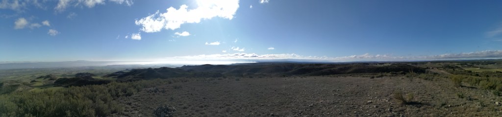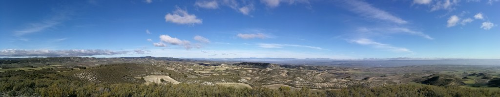 Cresteamos por la loma, desde donde podemos ver a nuestros pies a la izquierda, el Abejar de Pradilla. Solo nos quedan los últimos metros hasta llegar a lo alto del cerro. Desde aquí tenemos unas vistas privilegiadas del Monte Alto de Zuera, Mallos de Riglos, Sierra de Guara, cumbres del Pirineo, Sierra de Alcubierre, Moncayo…