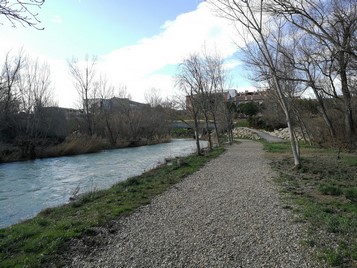 Iniciamos la ruta hacia las escaleras que bajan al parque para girar inmediatamente a nuestra derecha hacia el puente de hormigón que cruza sobre un brazo del río y se dirige a una pequeña isla poblada de vegetación. No llegamos a cruzar el puente, ya que bajamos hacia nuestra izquierda a la orilla del brazo del río. Al llegar a la altura de la Plaza de Toros tomamos el sendero a nuestra derecha.